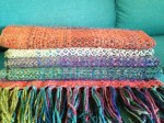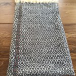 - Warp is a mix of cotton (noho flake, and 8/2), sea wool, and baby alpaca/cashmere. Weft is velvety merino 2ply, noho cotton and silk. 40″x94″ (with fringe).